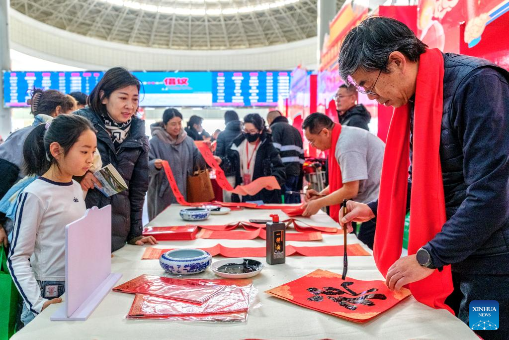 Calligraphers write Spring Festival couplets for passengers at Hohhot East Railway Station in Hohhot, north China's Inner Mongolia Autonomous Region, Feb. 2, 2026.