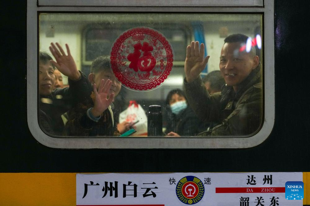 Passengers wave goodbye aboard a train at Guangzhou Baiyun Railway Station in Guangzhou, south China's Guangdong Province, Feb. 1, 2026.