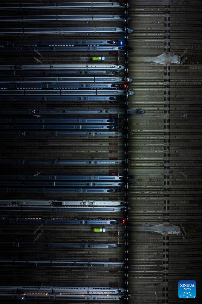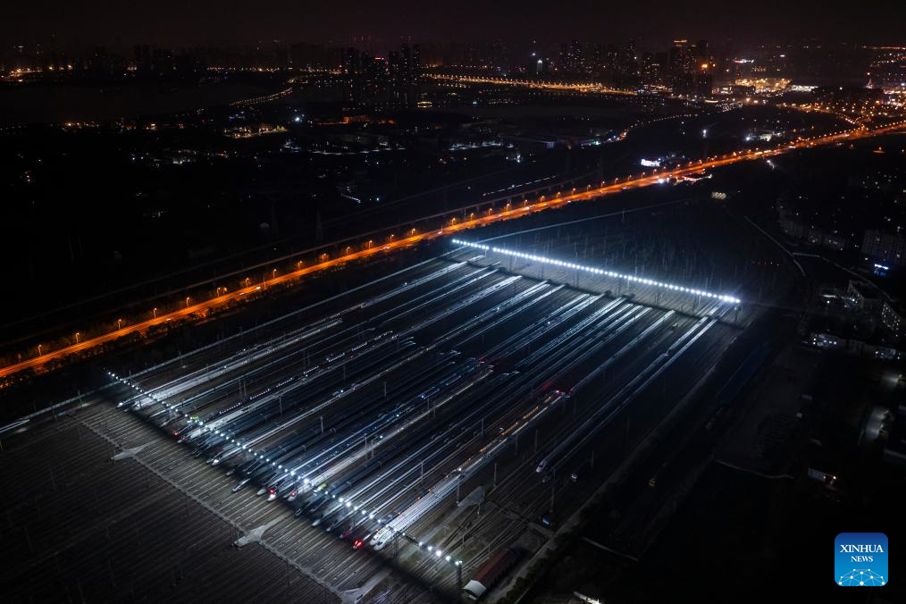 An aerial drone photo taken on Feb. 1, 2026 shows high-speed trains at a train depot in Wuhan, central China's Hubei Province.(Xinhua/Wu Zhizun)