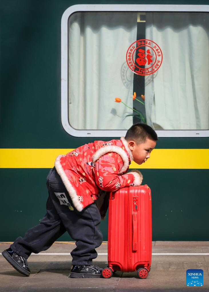 A boy boards a train at Nanjing Railway Station in Nanjing, east China's Jiangsu Province, Feb. 2, 2026.