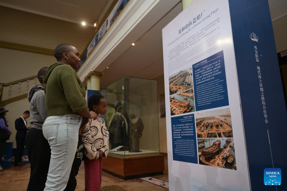 People visit a photo exhibition commemorating the 620th Anniversary of Zheng He's Voyages and the 62nd anniversary of the establishment of China-Kenya diplomatic relations, in Nairobi, Kenya, Dec. 19, 2025. (Xinhua/Liu Qiong)