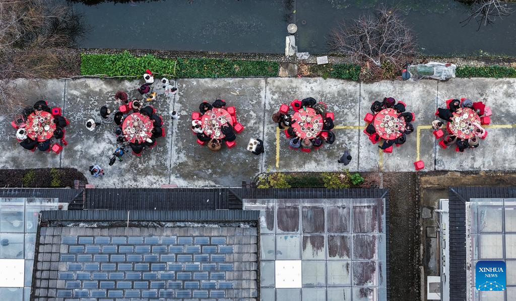 An aerial drone photo taken on Feb. 1, 2026 shows people dining on the street in Lianhua Township, east China's Zhejiang Province. A Spring Festival cultural event was held here with great enthusiasm on Sunday. Local residents and tourists enjoyed the festive market, viewed the local art exhibition, participated in traditional games, and savored local foods. (Xinhua/Xu Yu)