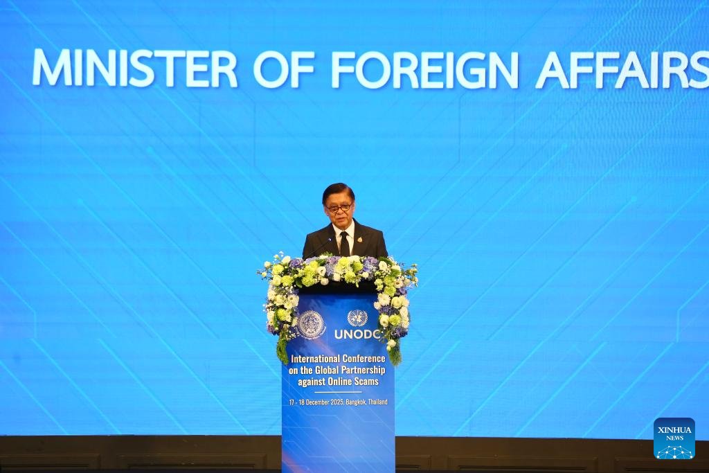 Thai Foreign Minister Sihasak Phuangketkeow speaks at the International Conference on the Global Partnership against Online Scams in Bangkok, Thailand, Dec. 17, 2025. The International Conference on the Global Partnership against Online Scams commenced here on Wednesday, aiming to forge a more coordinated response and strengthen cooperation in combating transnational crimes. (Xinhua/Sun Weitong)