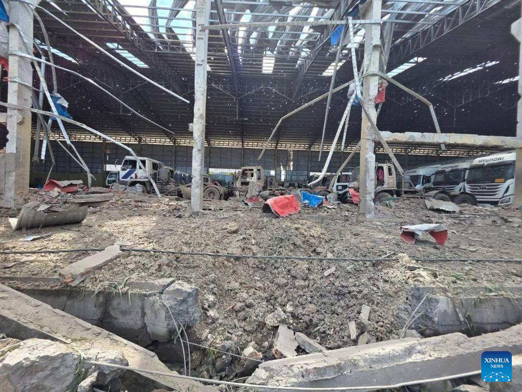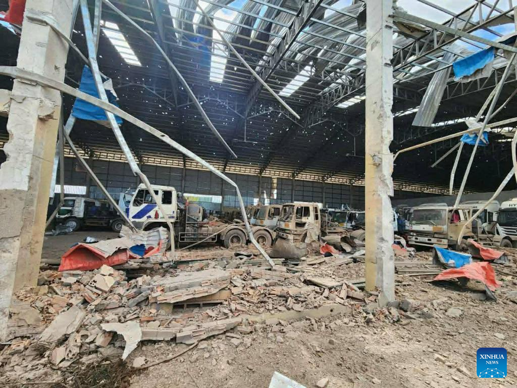 A civilian building destroyed by bombs dropped from a Thailand's fighter jet is seen in Poipet City of Banteay Meanchey province, Cambodia, Dec. 18, 2025. Border clashes between Cambodia and Thailand are still going on, as the civilian death toll in Cambodia has increased to 18, Cambodian spokespersons said on Thursday. (Agence Kampuchea Presse/Handout via Xinhua)