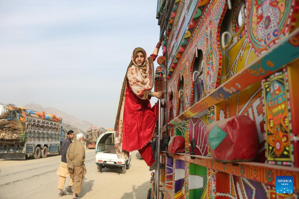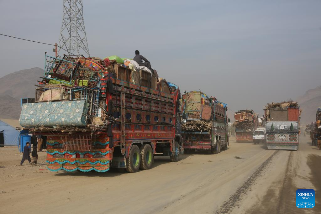 Trucks bound for Afghan returnees' home provinces from a temporary camp are seen at the Torkham border crossing, Afghanistan, Dec. 16, 2025. As the world marks International Migrants Day on Thursday, the unfolding narrative in Afghanistan is one of resilience and uncertainty.