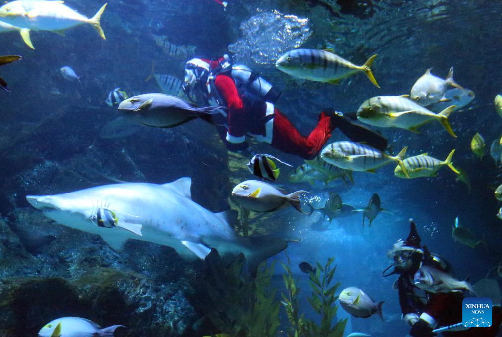 Divers dressed in Santa Claus costumes perform at the Sea life Bangkok Ocean World in Bangkok, Thailand, Dec. 18, 2025. (Xinhua/Rachen Sageamsak)