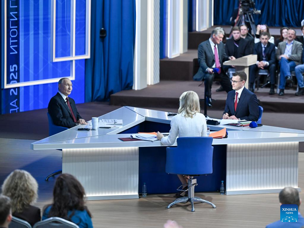 Russian President Vladimir Putin (C) speaks during his annual year-end press conference in Moscow, Russia, Dec. 19, 2025. (Xinhua/Hao Jianwei)