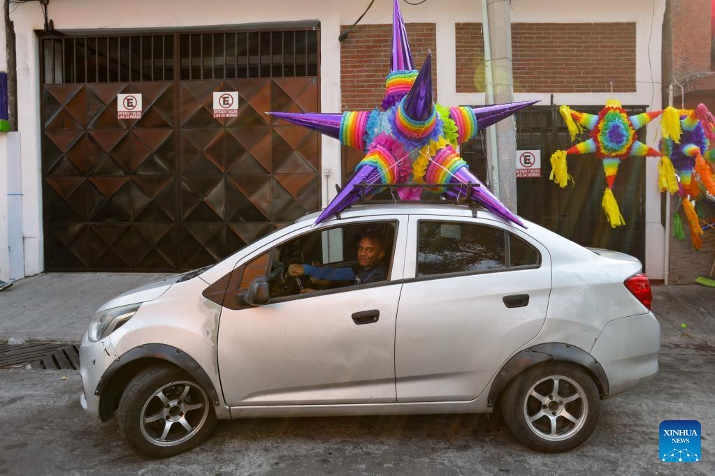 People buy a pinata outside a family workshop in Mexico City, the capital of Mexico, on Dec. 16, 2025. Pinata, traditionally crafted in the shape of a seven-pointed star, is filled with candies and small gifts, bringing joy and festive spirit to celebrations. (Xinhua/Francisco Canedo)