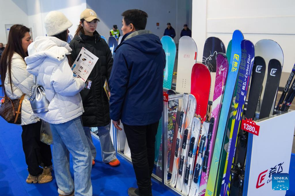 People learn about China-made carbon-fiber ski gears during the 9th Jilin International Ice and Snow Tourism Industry Exposition in Changchun, northeast China's Jilin Province, Dec. 18, 2025. The 9th edition of expo, with an exhibition area of over 60,000 square meters, kicked off here on Thursday. It showcases the vitality and prospects of Jilin's ice and snow-related business through immersive experiences in thematic pavilions. (Xinhua/Xu Chang)