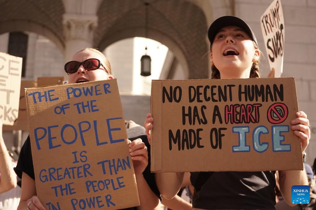 People attend a rally in front of the Los Angeles City Hall, in Los Angeles, California, the United States, Jan. 31, 2026. Multiple demonstrations were held on Saturday across Southern California against enforcement raids by U.S. Immigration and Customs Enforcement (ICE). (Photo by Zeng Hui/Xinhua)