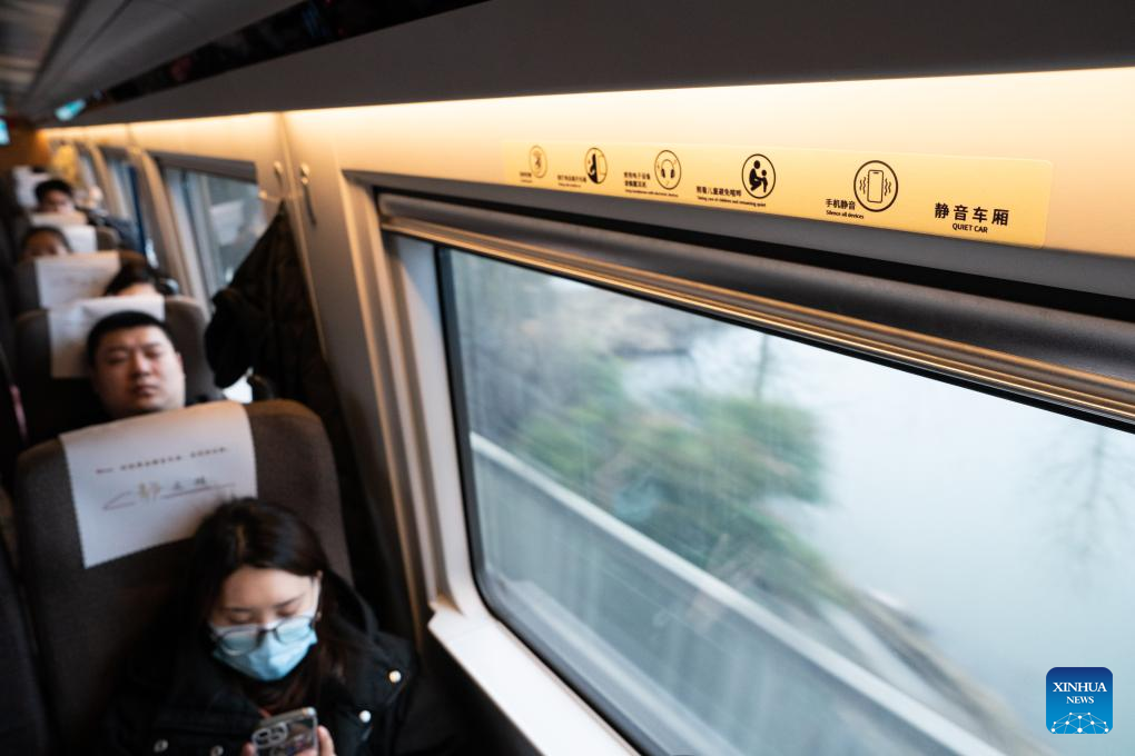 Passengers sit at a quiet car on train No. G54 travelling from Hefei, east China's Anhui Province to Beijing, capital of China on Feb. 1, 2026. More than 8,000 high-speed trains across China will provide quiet car services starting from Feb. 1, 2026. (Xinhua/Du Yu)