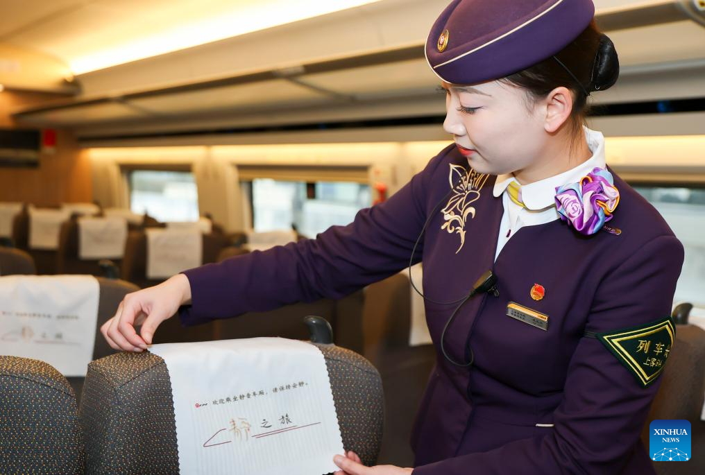 The conductor of train No. G12 travelling from east China's Shanghai to Beijing, capital of China arranges a headrest cover with a "Keep Quiet" sign at a quiet car on Feb. 1, 2026. More than 8,000 high-speed trains across China will provide quiet car services starting from Feb. 1, 2026. (Xinhua/Wang Xiang)