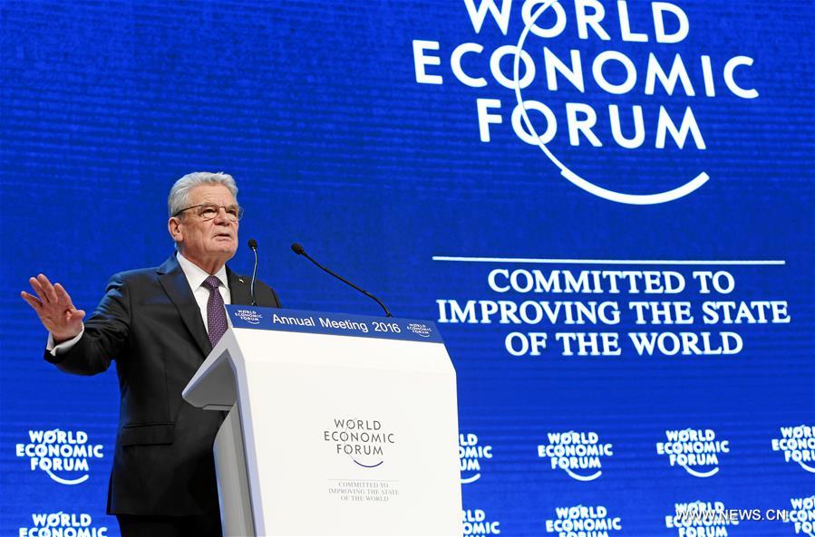 DAVOS, Jan. 20, 2016 (Xinhua) -- German President Joachim Gauck delivers a speech at an annual meeting of the World Economic Forum (WEF) in Davos, Switzerland, Jan. 20, 2016. The leaders from various key sectors highlighted the 4th industrial revolution will be driven by renewable energy at the 46th WEF annual meeting, which kicked off on Wednesday in Davos-Klosters, Switzerland. (Xinhua/WORLD ECONOMIC FORUM/Remy Steinegger)