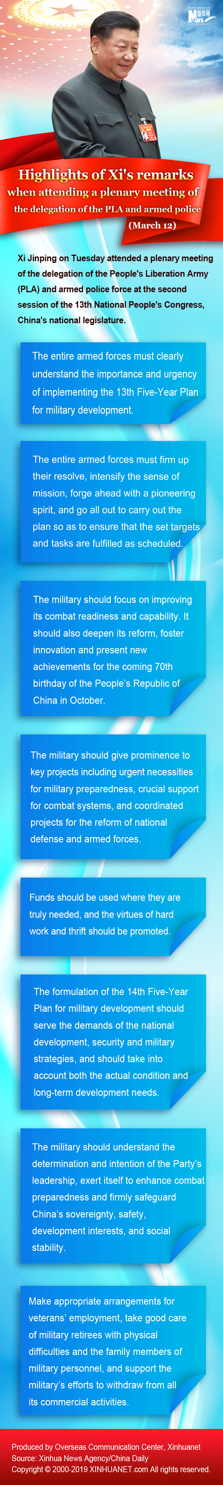 Infographic: Highlights of Xi's remarks when attending a plenary meeting of the delegation of the PLA and armed police (March 12)