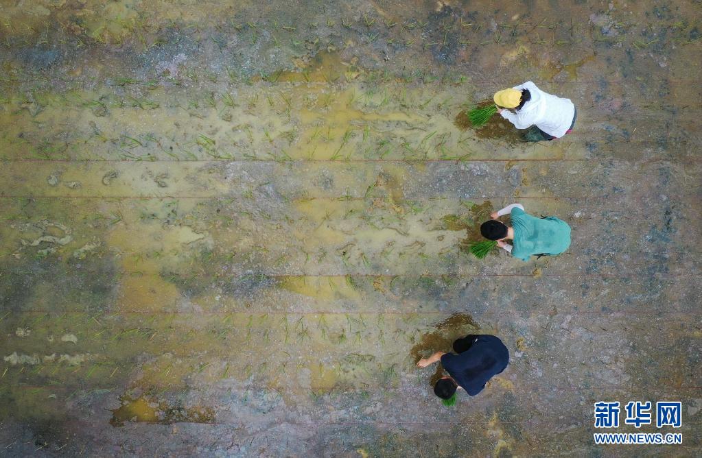研究人員在廣州增城華南農(nóng)業(yè)大學(xué)試驗田插種嫦娥五號搭載的太空稻秧苗(2021年3月29日攝,無人機照片)。共計40克的“天稻”于2020年11月搭乘嫦娥五號登月,歷時約23天、76萬公里的“環(huán)月旅行”返回地球。