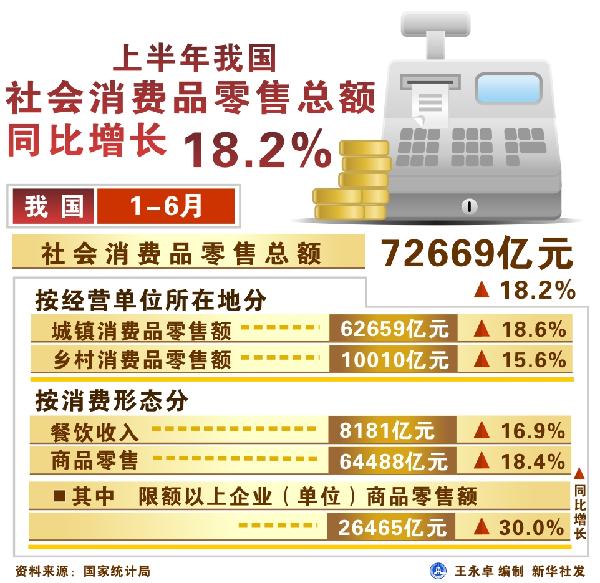 圖表:上半年我國社會(huì)消費(fèi)品零售總額增長18.2%