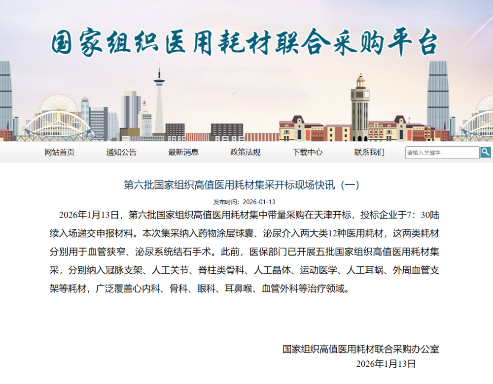 2026年1月13日,第六批国家组织高值医用耗材集中带量采购在天津开标,投标企业于7:30陆续入场递交申报材料。本次集采纳入药物涂层球囊、泌尿介入两大类12种医用耗材,这两类耗材分别用于血管狭窄、泌尿系统结石手术。此前,医保部门已开展五批国家组织高值医用耗材集采,分别纳入冠脉支架、人工关节、脊柱类骨科、人工晶体、运动医学、人工耳蜗、外周血管支架等耗材,广泛覆盖心内科、骨科、眼科、耳鼻喉、血管外科等治疗领域。