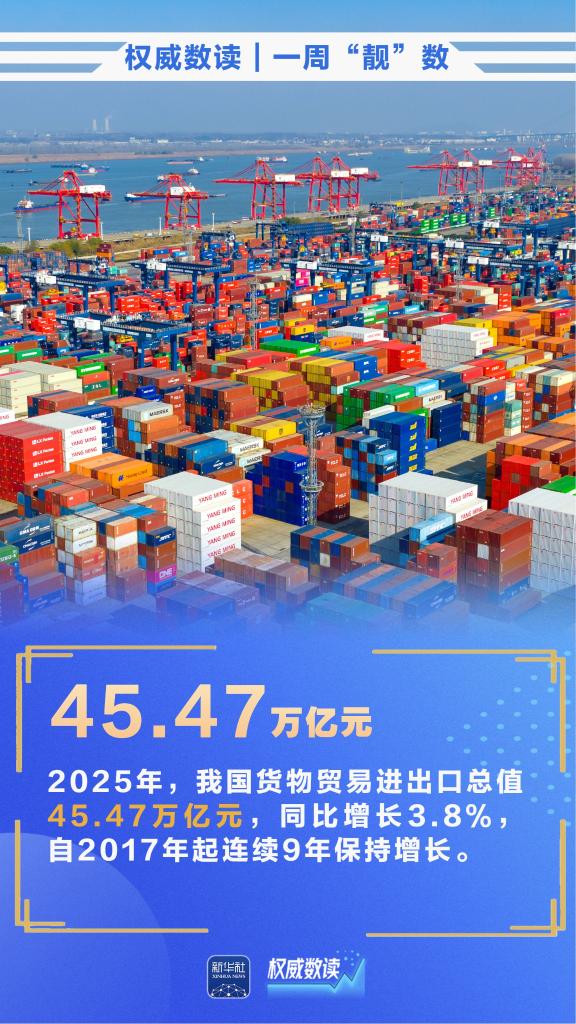 2025年,我国货物贸易进出口总值45.47万亿元,连续9年保持增长;汽车产销量双双突破3400万辆,连续17年稳居全球第一;全国营业性演出票房收入超616亿元……本周,这些数据最值得关注!