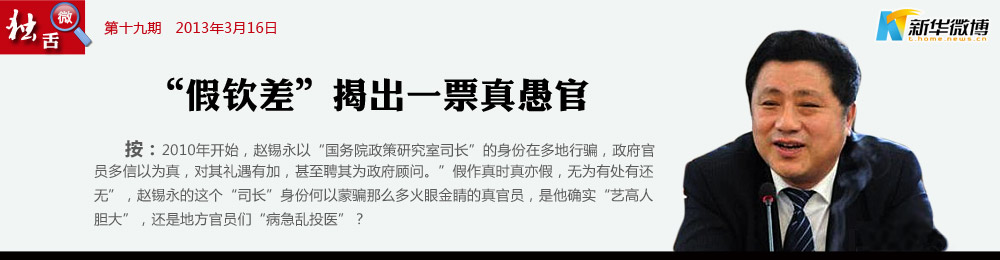 一句話告訴你真相 一句話評趙錫永事件:騙子騙術(shù)并不高明,只是這些地方官員見到“上面”來的,便做條件反射式的恭迎,而不敢去做辨別,唯恐犯了大不敬,背后還是“官本位”的思想在作怪。