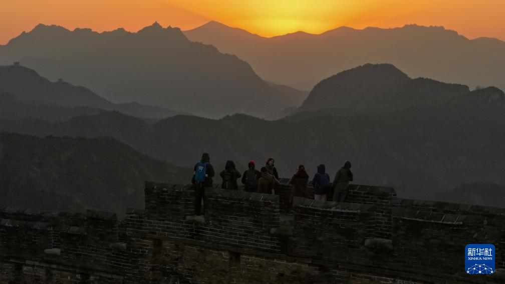 11月15日清晨,游人在河北省承德市滦平县金山岭长城观看日出(无人机照片)。