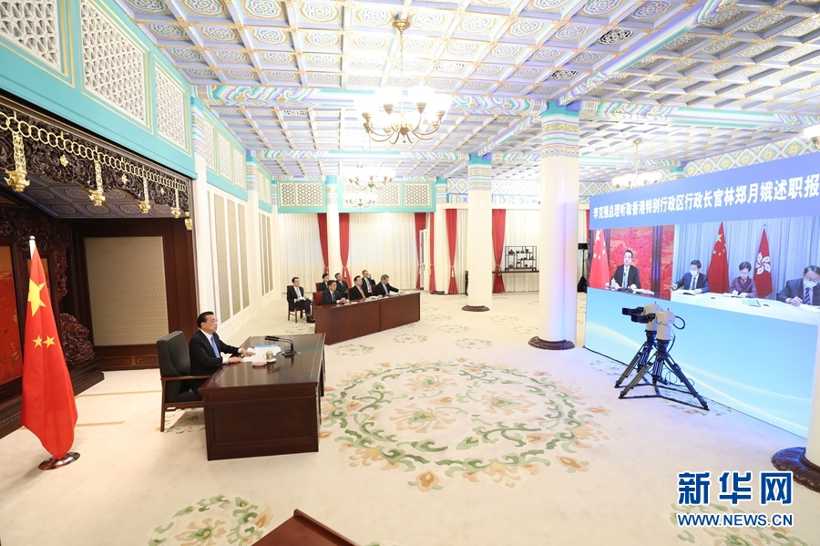 新華社北京1月27日電? 國(guó)務(wù)院總理李克強(qiáng)1月27日上午在中南海紫光閣以視頻連線方式聽取香港特別行政區(qū)行政長(zhǎng)官林鄭月娥2020年度的述職報(bào)告。林鄭月娥匯報(bào)了香港特別行政區(qū)政府過去一年工作和新冠肺炎疫情防控等情況。