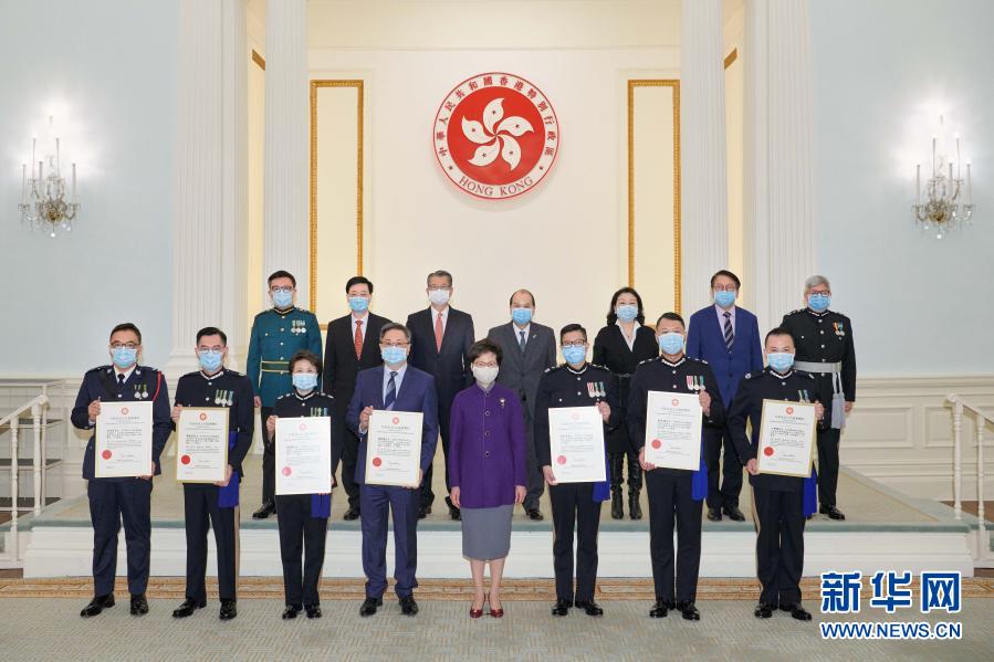 2月10日,香港特區(qū)行政長官林鄭月娥向7名現(xiàn)任和前任警務(wù)處高級警務(wù)人員頒發(fā)行政長官公共服務(wù)獎狀,以表彰他們?yōu)榫S護國家安全作出的重大貢獻。新華社發(fā)