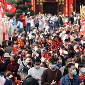 初一下午,大批市民在黃大仙祠前的廣場上排成長龍,有序往前“流動”。入口處豎立著一塊電子顯示屏,上有祠內(nèi)人數(shù)實(shí)況,提醒門口防疫人員何時(shí)放行。