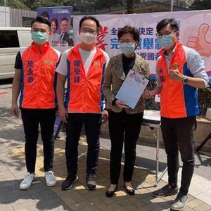 3月15日,香港特區(qū)行政長(zhǎng)官林鄭月娥(右二)在位于港鐵堅(jiān)尼地城站的街站展示簽名。新華社發(fā)