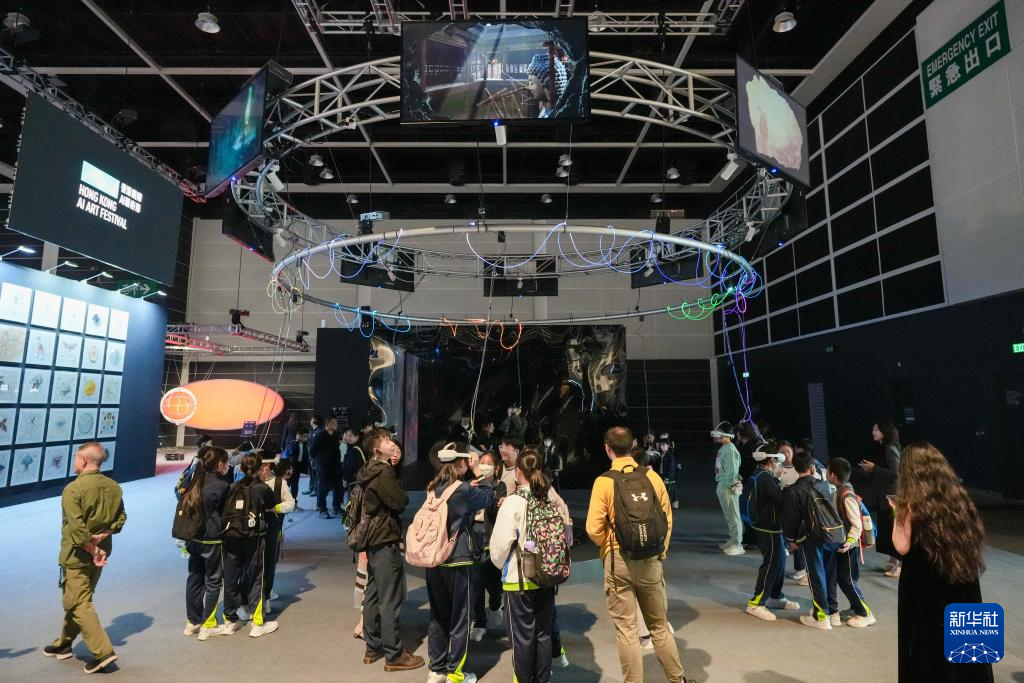 12月19日,学生在首届香港国际AI艺术节上参观体验。新华社记者 朱炜 摄