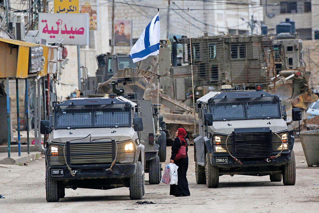 1月22日,在约旦河西岸北部杰宁,一名巴勒斯坦妇女走过以军车辆