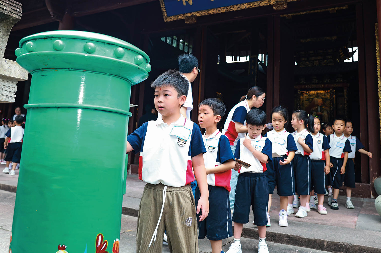 2024年8月28日,宁波市中城小学一年级新生在开学礼结束后向邮筒内投入写有对自己未来期望的明信片