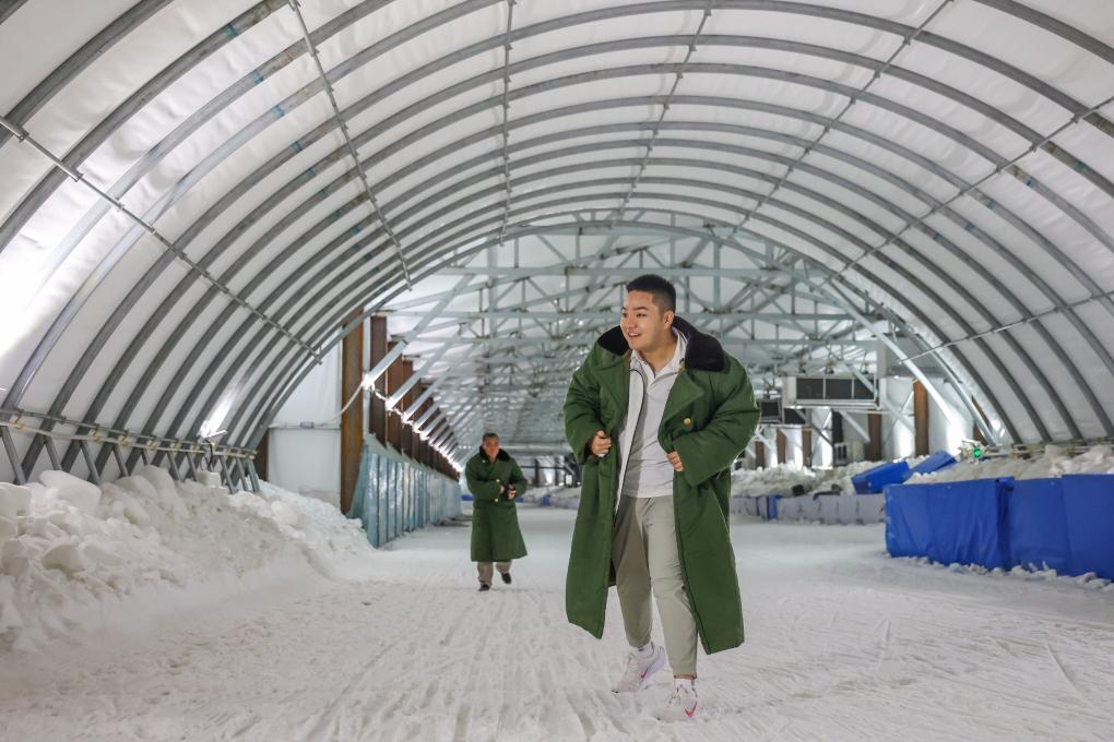 8月17日,王剑书体验河北承德国家雪上项目训练基地的四季训练馆雪道。