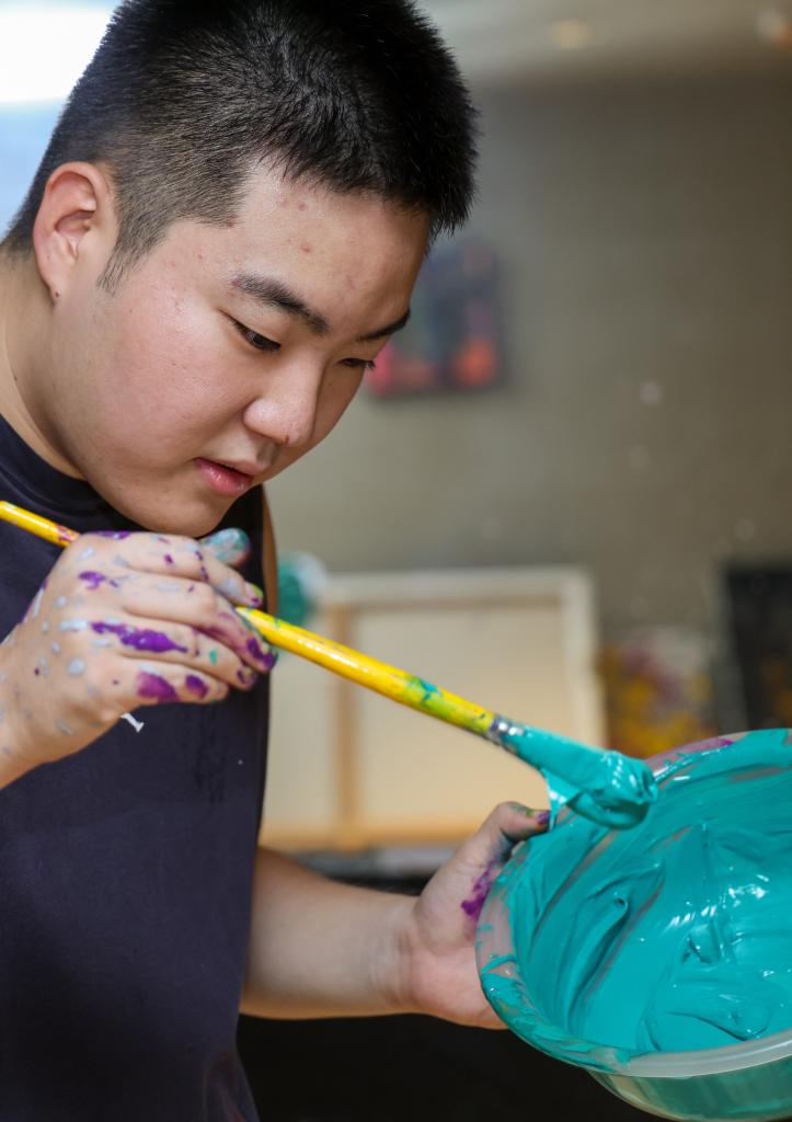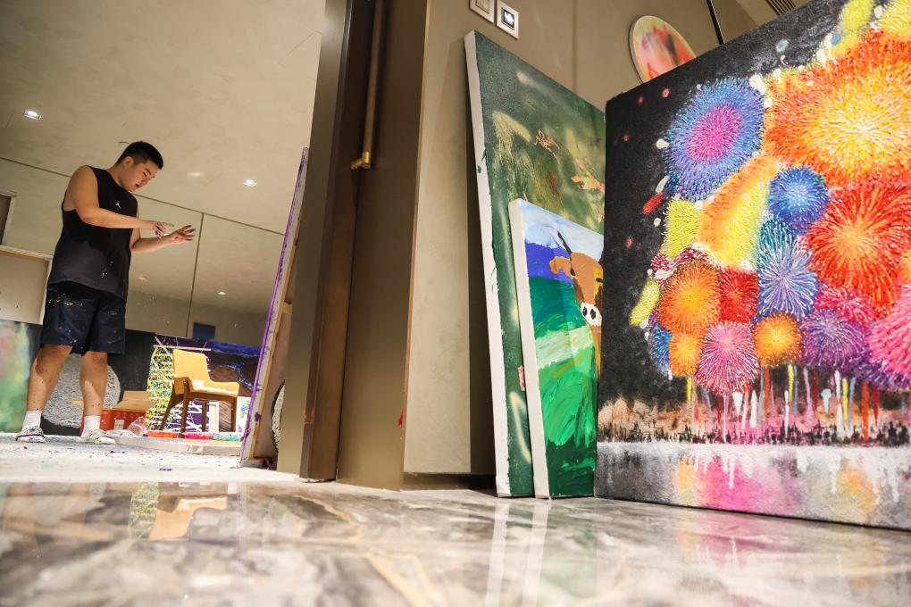 8月8日,王剑书在北京的画室创作滴洒画时,开心得跳起来。