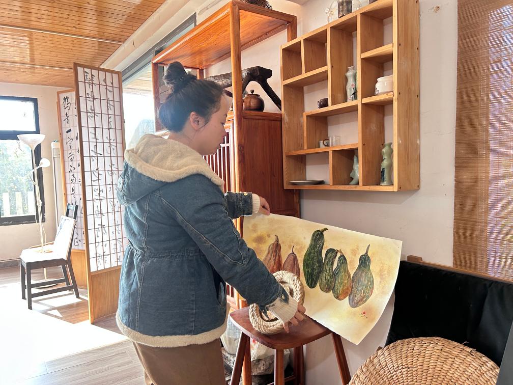 新华社武汉12月18日电(记者熊翔鹤)阳光透过窗棂,懒洋洋地落在画桌上。一只名为“莫奈”的玄猫躺在桌角,店主林一蓓收拾着颜料工具箱,准备开始一天的岩彩绘画创作。屋外,鸟雀啾鸣,微风轻拂草木,隔壁农户忙着为菜园松土。