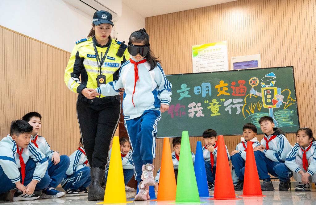 3月30日,天津市公安局滨海分局交通管理支队民警在天津市滨海新区塘沽贻成小学以互动方式为学生讲解道路交通安全知识。