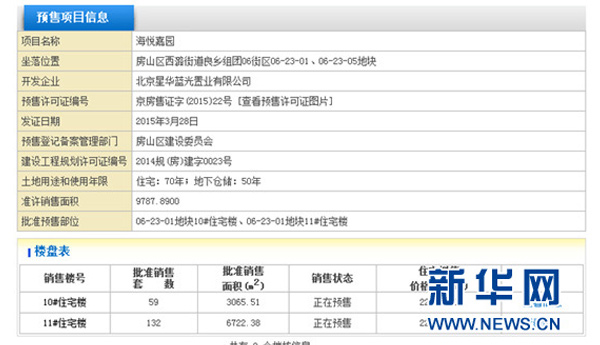 然記者查閱住建委官網(wǎng)獲知,截至6月5日,藍(lán)光海悅城獲得過三次預(yù)售證,分別為京房售證字(2014)162號,京房售證字(2014)227號,京房售證字(2015)22號,對應(yīng)于三期項目,目前尚未獲批四期預(yù)售證。[詳情]