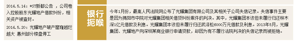 興潤崩盤,曾被媒體評論為“推倒了2014年中小房企崩盤的第一張多米諾骨牌”。隨后,資金鏈斷裂、房企破產、項目爛尾等聲音此起彼伏,這些案例中,最令市場關注的,莫過于近日瘋傳的“光耀地產資金鏈斷裂”事件。5月7日光耀地產公開發(fā)表聲明,承認公司面臨資金鏈問題,但否認了瀕臨破產的說法,之后也表示愿意接受其他企業(yè)的收購。 |