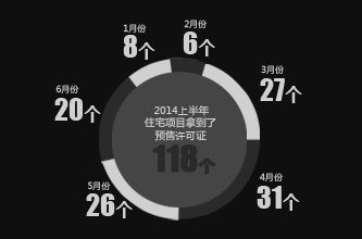 2014年上半年,共有118個(gè)住宅項(xiàng)目拿到了預(yù)售許可證。批準(zhǔn)銷售總套數(shù)為38363套,已銷售套數(shù)為11146套。其整體月均去化率為13.64%。