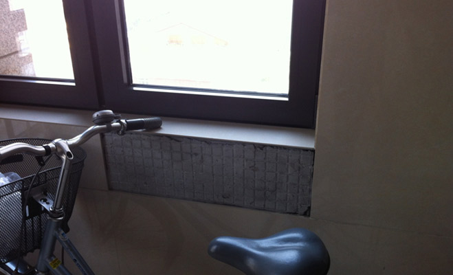 當(dāng)記者與劉爺爺來到他居住的樓門前時(shí),發(fā)現(xiàn)大門并沒有門禁,劉爺爺對(duì)記者說,看上去豪華的大門,其實(shí)一點(diǎn)都不實(shí)用。記者試了一下,發(fā)現(xiàn)確實(shí)很沉重,如果孩子自己開門,估計(jì)很難打開。劉爺爺說這個(gè)小區(qū)的實(shí)際質(zhì)量和宣傳相差甚遠(yuǎn),樓內(nèi)的瓷磚有掉落現(xiàn)象,安全梯鋪設(shè)的十分簡(jiǎn)陋。劉爺爺讓記者從十五層向下俯視,小區(qū)所宣傳的法式園林只是一些楊樹和柳樹。庭院中間的小涼亭連休息的椅子都沒有,基本都是擺設(shè)。