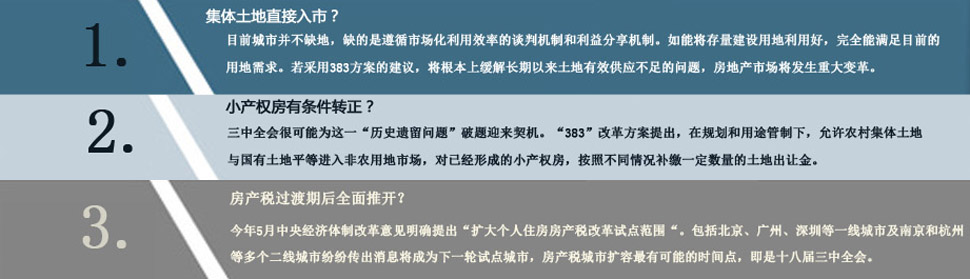 | 隨著十八屆三中全會的臨近,國務(wù)院發(fā)展研究中心專家的“383報告”引起熱議。 具體到房地產(chǎn)領(lǐng)域,“383方案”中共提到土地改革、小產(chǎn)權(quán)房、金融改革以及房產(chǎn)稅三個方面,與近期業(yè)內(nèi)討論很多的房地產(chǎn)長效調(diào)控機制相關(guān)。 "土改"將成新的突破點,為樓市變革指明新的方向。 [詳細(xì)] |