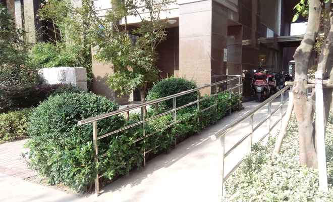 記者在榮盛馨河酈舍發(fā)現(xiàn),每棟樓的入戶門前不僅有臺(tái)階可以上去,還專門留出了可供輪椅通行的殘疾人通道。可見,不僅是后期的物業(yè)服務(wù)體現(xiàn)溫馨,開發(fā)商前期規(guī)劃設(shè)計(jì)同樣如此。
