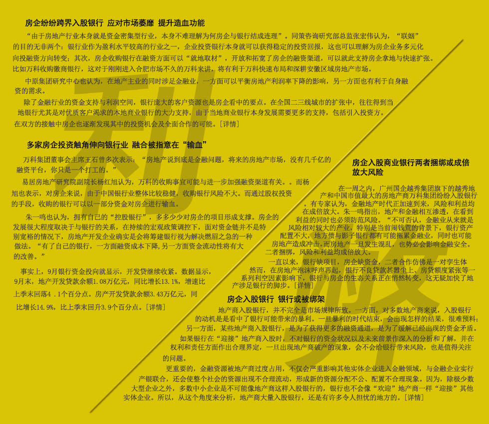 萬科、新華聯(lián)等房地產(chǎn)企業(yè)近日紛紛表示將進(jìn)軍銀行業(yè),此舉引發(fā)"土豪"與"金融"的一輪聯(lián)姻熱潮,這也預(yù)示著具備類金融屬性的地產(chǎn)公司正式從幕后走向臺前。業(yè)內(nèi)人士表示,房企與銀行攜手,意味著地產(chǎn)融資和多元化投資將出現(xiàn)新模式。房企參股銀行一方面可以為其融資提供便利,另一方面可享受銀行業(yè)較高的投資回報,成為多元化投資的新途徑。[詳情] |