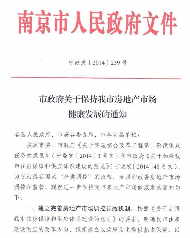 9月21日下午,南京市政府正式發(fā)文,明確全面取消住房限購,即日起購房不再需提供新購住房證明,持續(xù)三年零9個月的南京樓市“限購令”宣告退出歷史舞臺。據(jù)了解,2011年2月,“限購令”正式落地南京,為火熱的樓市澆了一盆冷水。但進(jìn)入2012年之后,南京樓市逐漸回暖,2013年更是進(jìn)入全面瘋狂。直至2014年以來,樓市開始疲軟,國家統(tǒng)計局?jǐn)?shù)據(jù),南京房價6月、7月、8月連續(xù)下跌三個月,9月樓市庫存量更是重回5萬套大關(guān),解除限購的呼聲愈來愈高。據(jù)悉,南京解除限購令之后,全國目前只剩北京、上海、廣州、深圳、珠海、三亞6個城市仍執(zhí)行樓市限購政策。