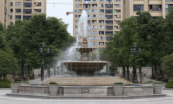 小區(qū)內(nèi)綠化布置以生態(tài)、綠色為先導,充分利用其樓間距的距離,形成縱深交錯,層層合圍的平面布局。一路走來,花卉植物、雕像噴泉、卵石路徑,滿目皆是。