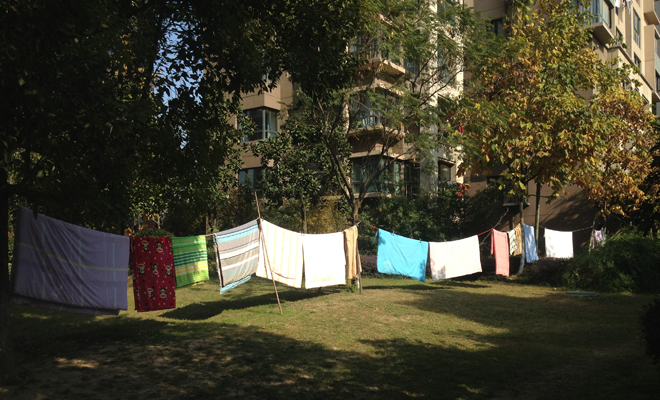 同時,記者還看到,不少業(yè)主將繩子綁在小區(qū)樓宇空地間的大樹上,然后晾掛起棉被和衣物,如此做法讓小區(qū)看上去極不美觀。