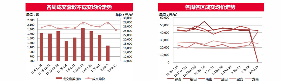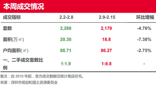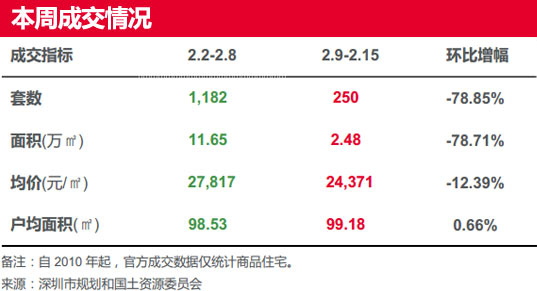 | 本周(2.9-2.15)鹽田區(qū)只成交1套高端物業(yè)“藍(lán)郡西堤”,成交均價(jià)環(huán)比上漲79.9%。其余各區(qū)均不同程度下跌,其中,龍崗區(qū)跌15%、寶安區(qū)跌8.42%、福田區(qū)跌2.36%;羅湖區(qū)及南山區(qū)本周(2.9-2.15)無成交。 | ||||