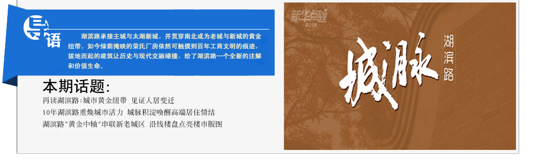 城市的發(fā)展幾經(jīng)嬗變,但是萬變不離其宗,依然有幾條路發(fā)揮著黃金紐帶的作用。湖濱路,無錫人無人不知無人不曉,因榮氏家族而聞名。經(jīng)過城市發(fā)展,昔日的工商業(yè)源頭之一,已經(jīng)蛻變?yōu)槿缃竦母叨俗≌瑓^(qū)。