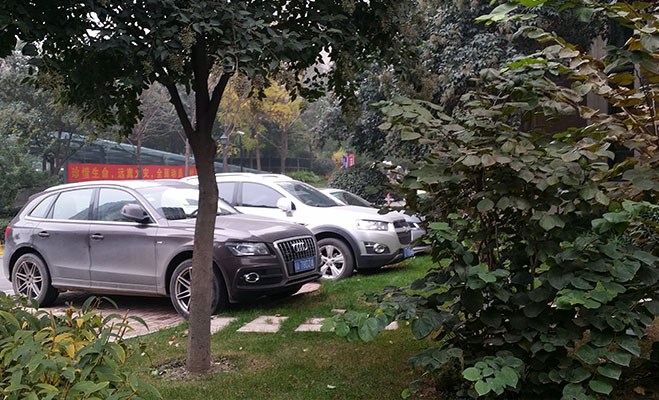 記者在小區(qū)內(nèi)也看到,有公共綠化區(qū)域或者通道被汽車或者電動車占用的現(xiàn)象,一位業(yè)主告訴記者,這還是在白天,晚上的情況更加嚴重,一到下班時間,馬路的二級輔道也會長長地停著一排車,物業(yè)對此不聞不問。