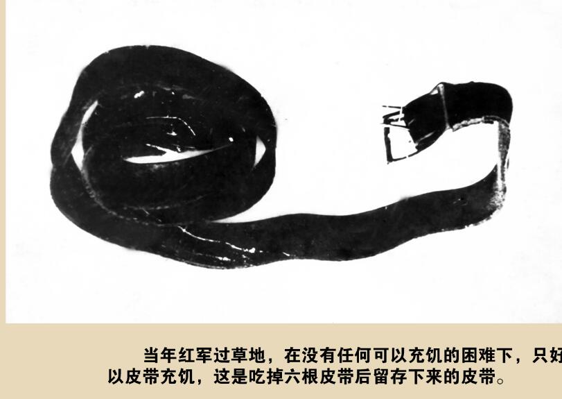 原來,這條皮帶是周廣才在1934年的一次戰(zhàn)斗中繳獲敵人的戰(zhàn)利品。但為了使全班戰(zhàn)友活下來,他只得含淚將皮帶拿出來。皮帶被切成幾段丟入滾燙的熱水中,煮熟后每人夾起“一截”狼吞虎咽的吃起來……當鍋里還剩最后“一截”時他哭著說:“同志們,咱們留著它作個紀念吧,帶到延安去見毛主席?!睉阎鴮Ω锩鼊倮臒o限渴望,最終他們把這截皮帶留了下來。