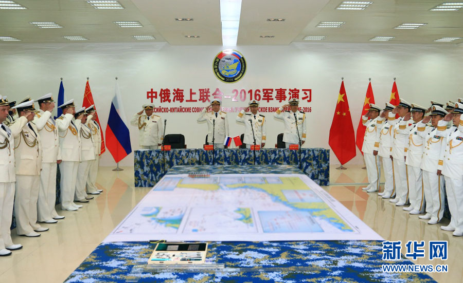 ????9月13日,中俄“海上聯(lián)合—2016”軍事演習開幕式在演習導演部舉行,中方總導演、中國海軍副司令員王海和俄方總導演、俄羅斯海軍副司令費多堅科夫共同宣布演習開始。